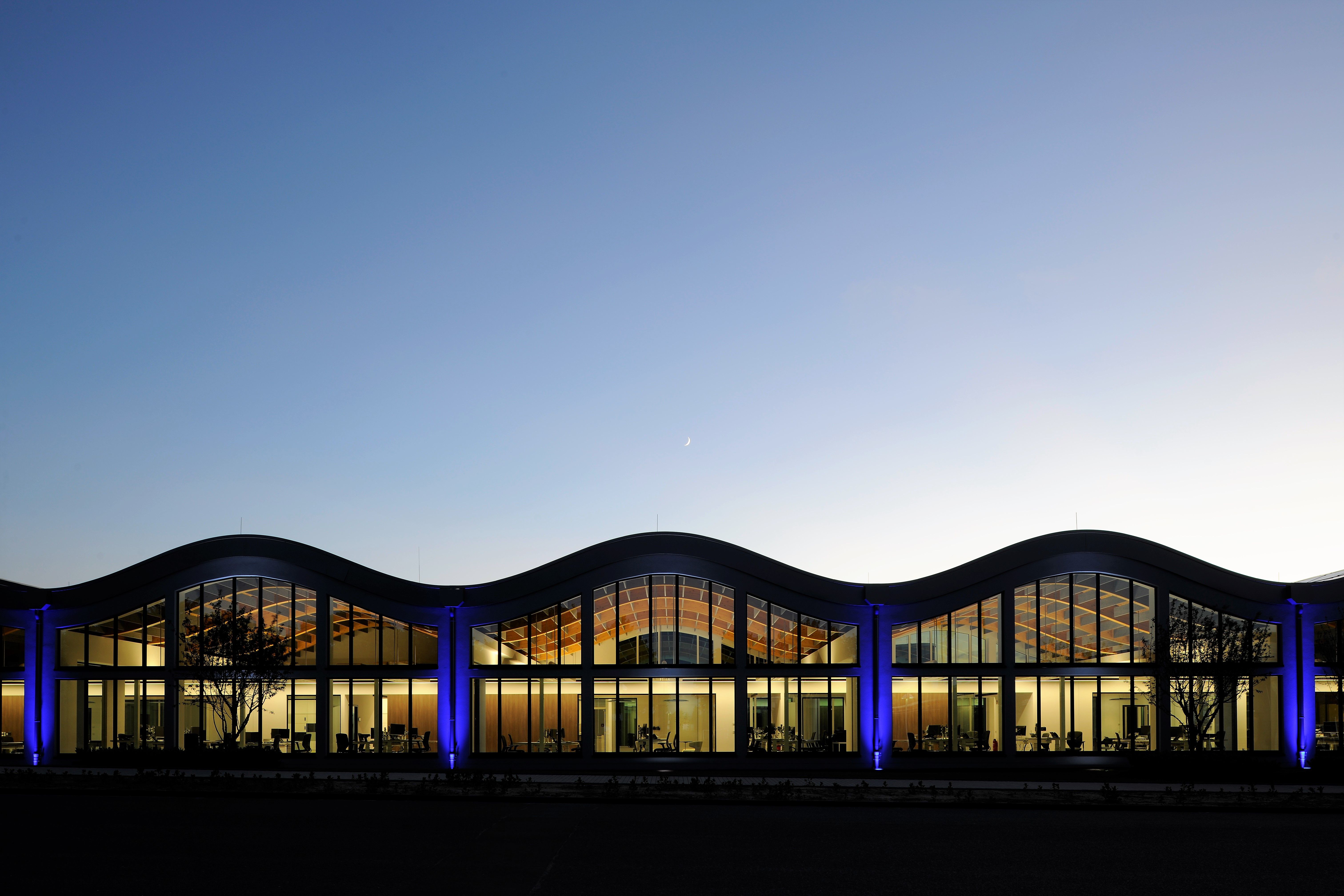 Two identical protracted office wings were erected facing each other with a shift -. A central elliptical unit is located between the two long office wings, this accommodates social areas- in the basement: server rooms,storage rooms, and building engineering equipments, - in the ground floor: an entrance hallway, meeting rooms, kitchen and canteen and the playroom - on the rooftop: ventilation and air conditioning equipments.