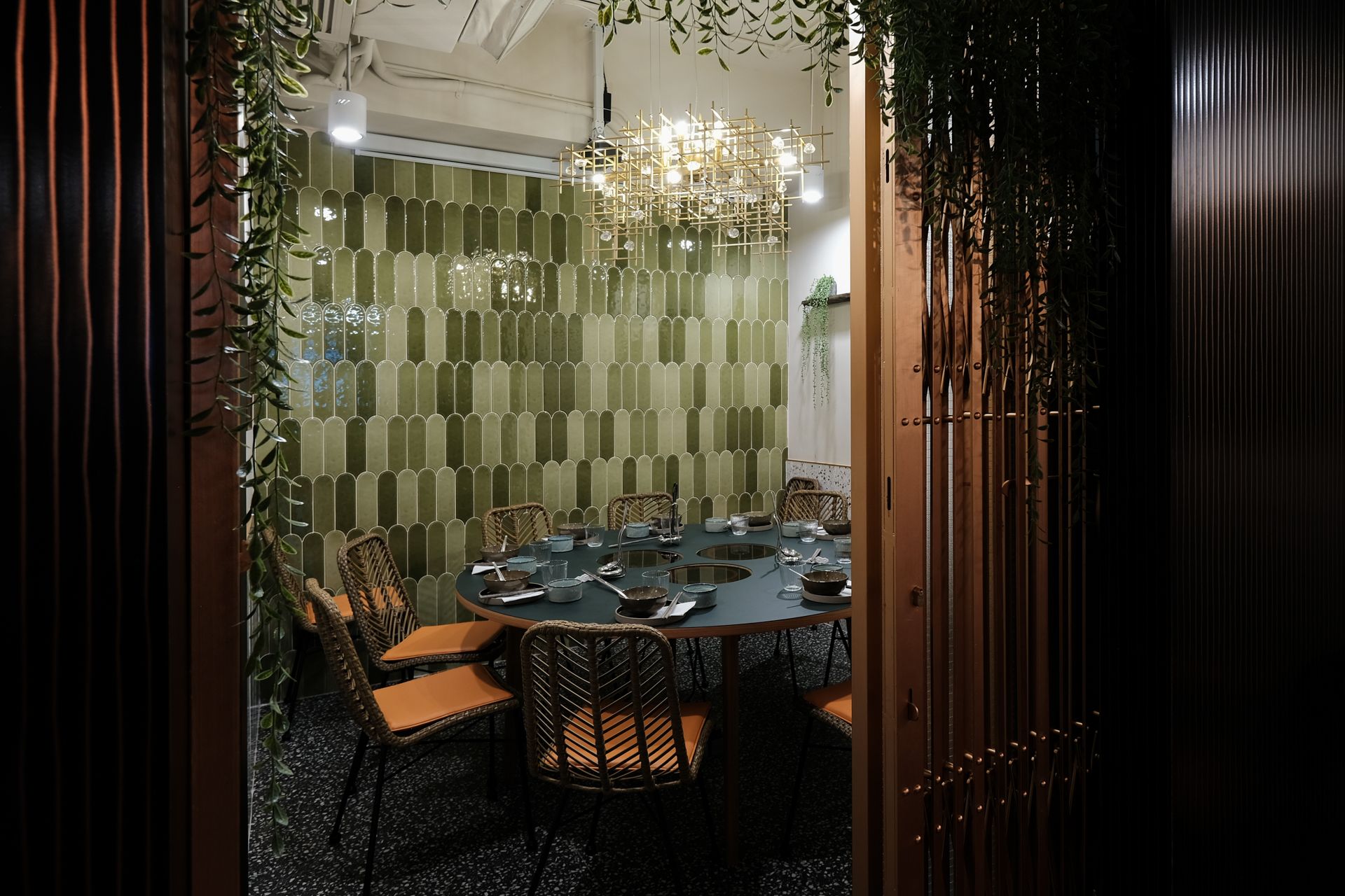 Cloud Nine is a contemporary restaurant in Hong Kong that combines authentic Southeast Asian flavors with traditional hotpot. Its quaint and cozy environment gives diners a familiar feeling, reminiscent of gathering at an old friend’s home. A nostalgic backdrop of terrazzo tiles and glass bricks sets the stage for contrasting play on colors. Wall feature panels of dried spices and ingredients cast in epoxy are inspired by rattan screens of a bygone generation – a culmination of the owner’s vision of a restaurant that feels and tastes ‘like home’.
