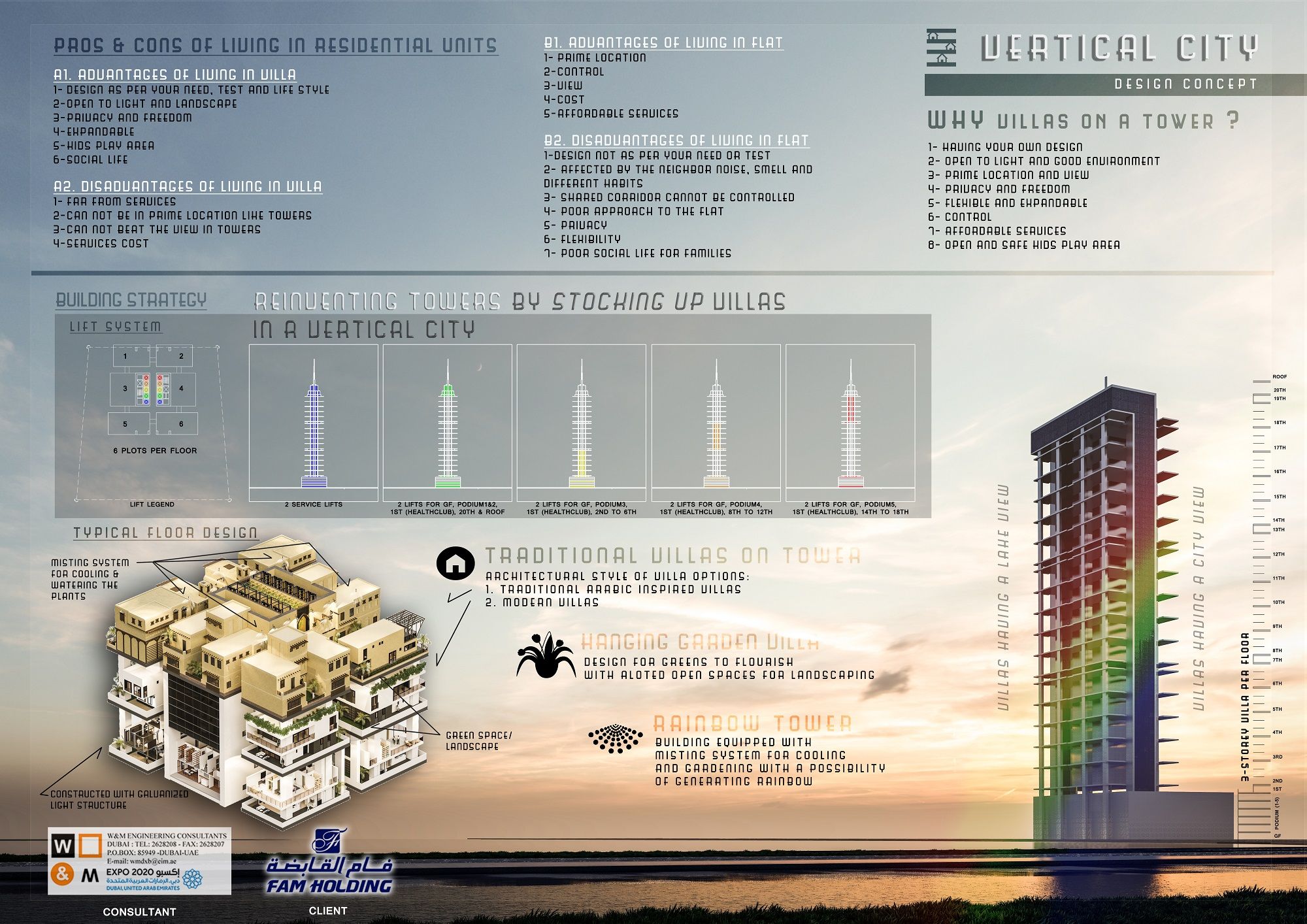In our genuine proposal, for VIP and special client’s accommodation, we decided to offer a special accommodation for ambition clients whom looking for new experience in vertical accommodation. The main concept is offering lands for sale on tower, triplex height floors. These lands are separated by open traditional lanes connecting the units. Clients have the chance to select their own hanged villas design on that lands,as per their own needs with variety of variable areas and heights of the spaces, with gardens and dedicated pools, without corridors or regular attachments disadvantages.