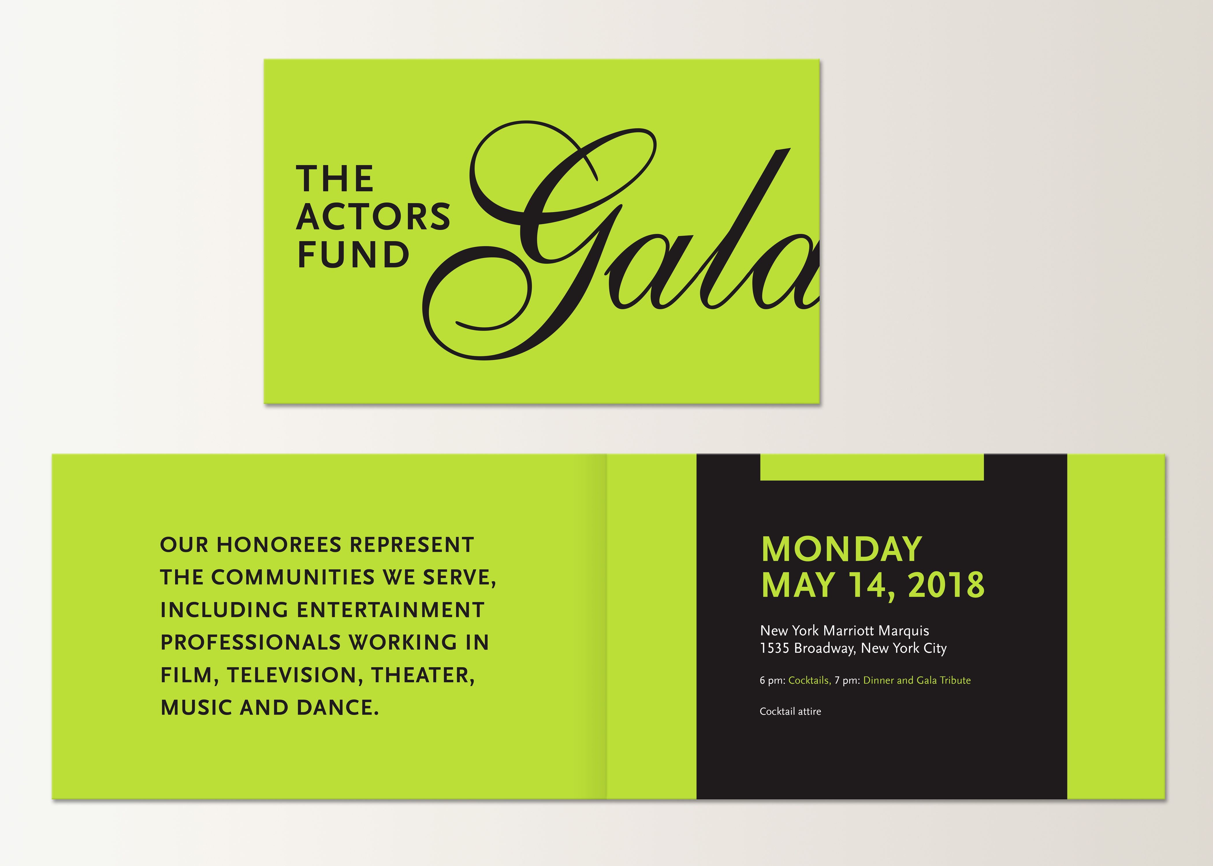 A print invitation to promote the 2018 Actors Fund Gala. I created this saddle-stitched booklet format to allow for full bleed photos and let each honoree shine. The Actors Fund is a national human services organization that fosters stability and resiliency, and provides a safety net for performing arts and entertainment professionals over their lifespan. Photo of Chita Rivera: Laura Marie Duncan. Photo of Uma Thurman: Peter Lindbergh.