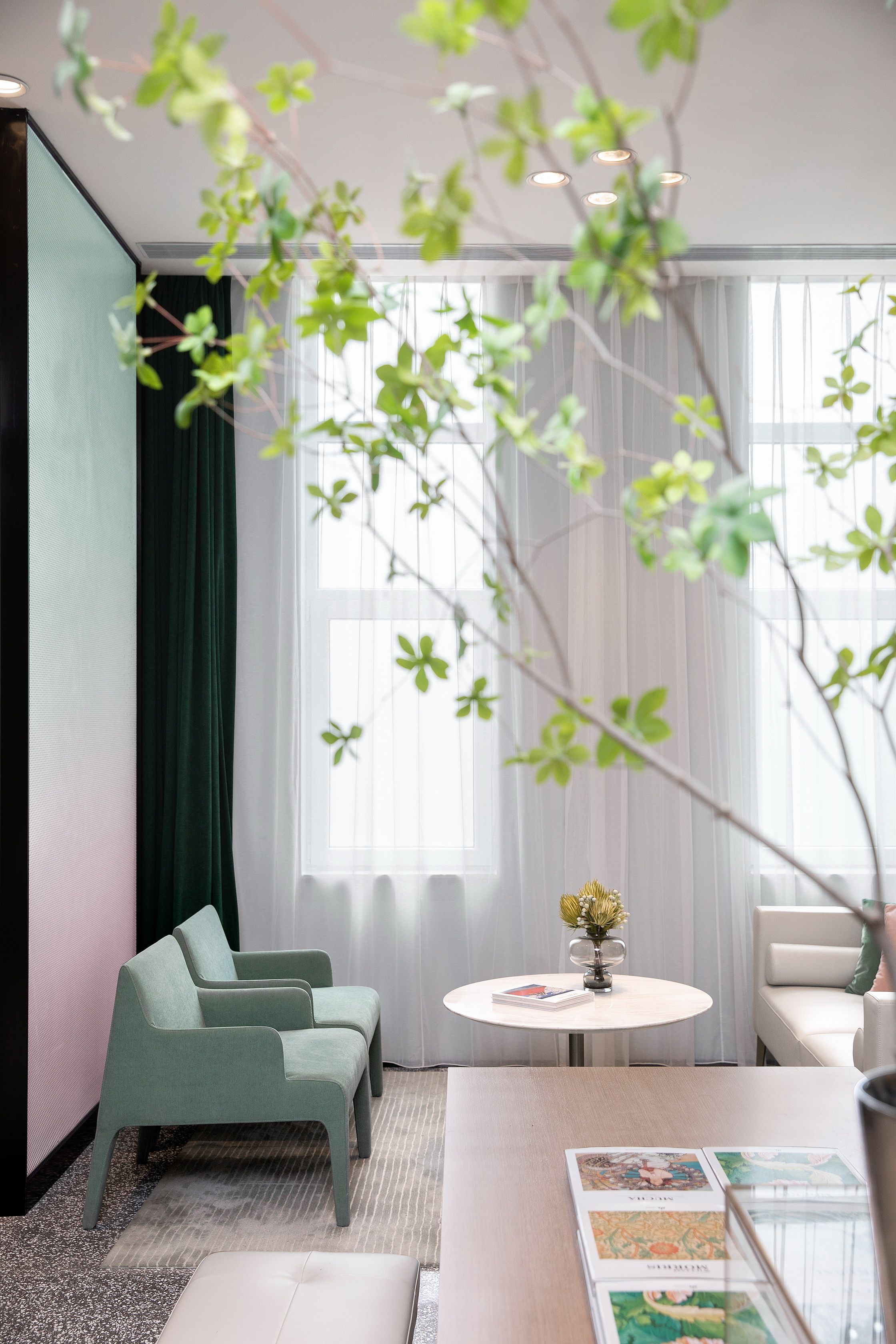 The inspiration of this case comes from the imaginative fairy tale"the wizard of Oz".It creates a unique exhibition center with a wonderful journey about "looking for self".We are committed to infiltrating modern,artistic and interesting atmosphere into every detail.The main color is aqua green, which is clear and natural in color, green with high brightness and low saturation.It is elegant in vision and does not lose vitality and atmosphere.At the same time, some accessories are matched with light pink to create a warm and soft environment,which gives the whole space more liquidity vitality.