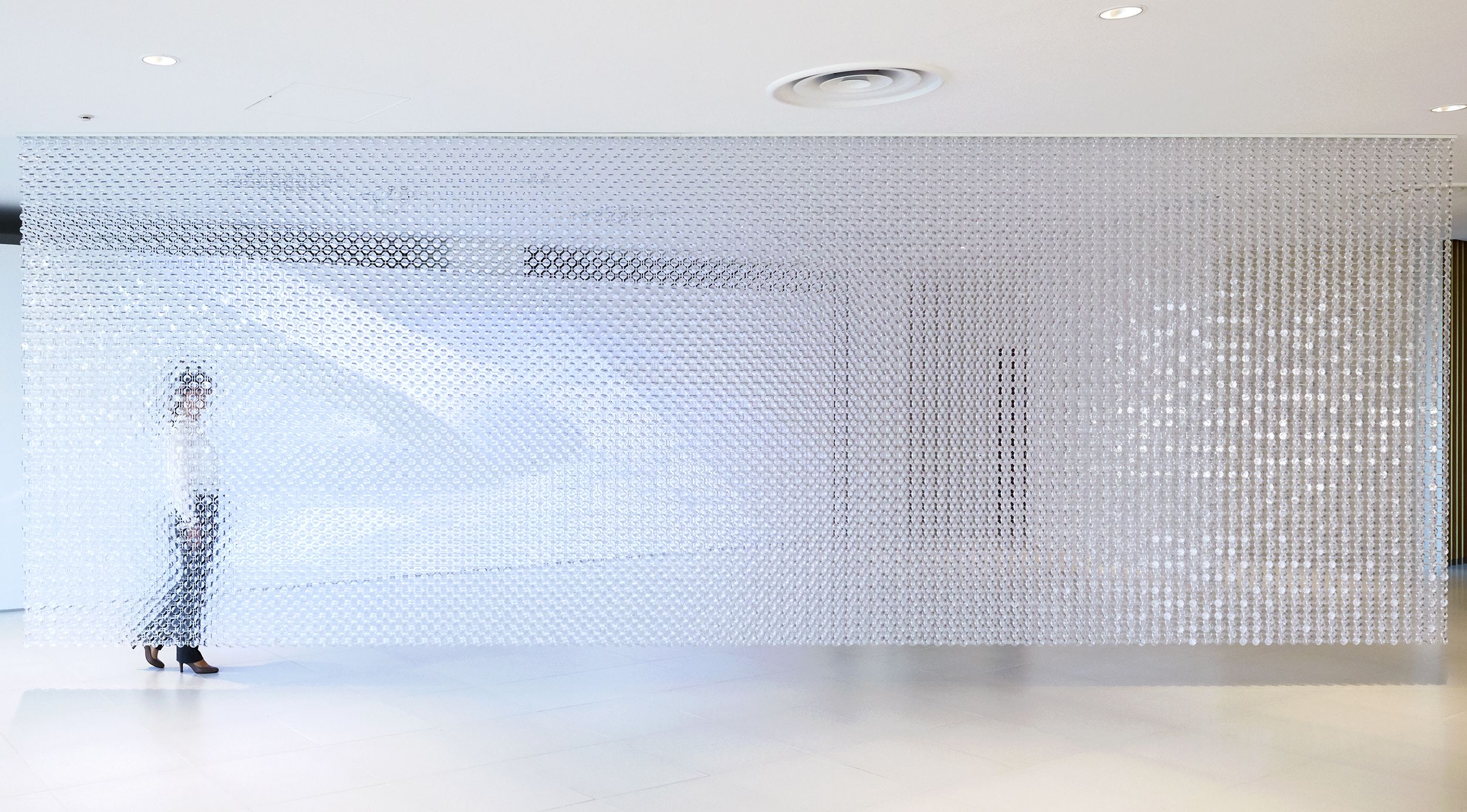 This Installation was designed for the entrance lobby of the building of a global precision components corporation based in Japan. By methodically assembling small, thin lenses to finely pick up the light and create large screens of light, we embody our client's corporate statement, "Miniature Technology, Infinite World". The screen is made of own art pieces named "lightflakes", designed with the concept of restructuring light. This project enhances the value of a company's entrance by fusing the expression of the client's corporate statement with the features of the artwork and embodying it.