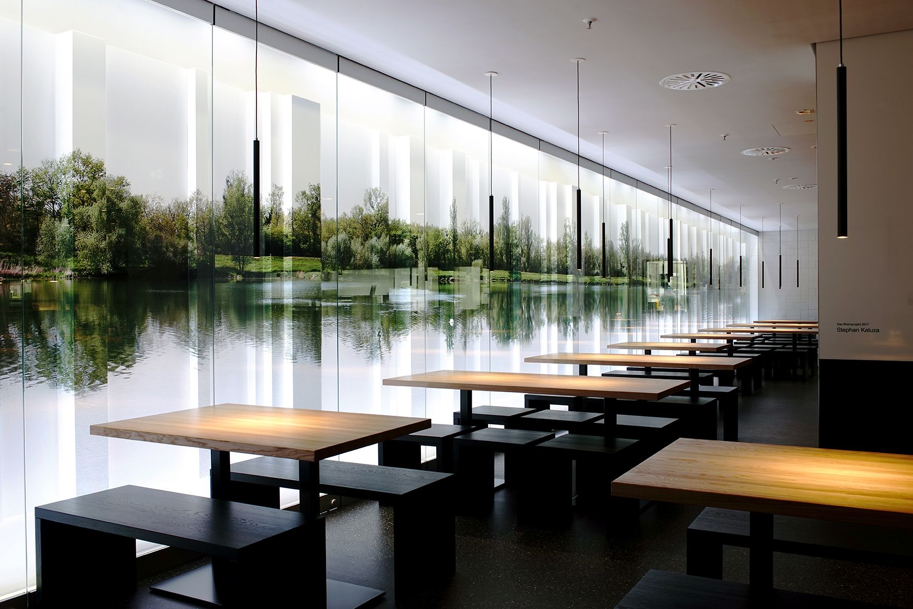 As part of a modernization project, this staff restaurant in a basement area was to be renovated, including the lighting. An essential part of the design task was to introduce daylight and a visual relation to the exterior by building a new light well. For structural reasons, only small windows could be realized, which didn't take enough daylight in to have noticeable effects. Thus the idea of a floor-to-ceiling, ≈ 20 m long artificial LED panorama window wall came up to create a lighting atmosphere that adapts in color, variation, intensity etc. to the circadian rhythm (HCL) of the users.