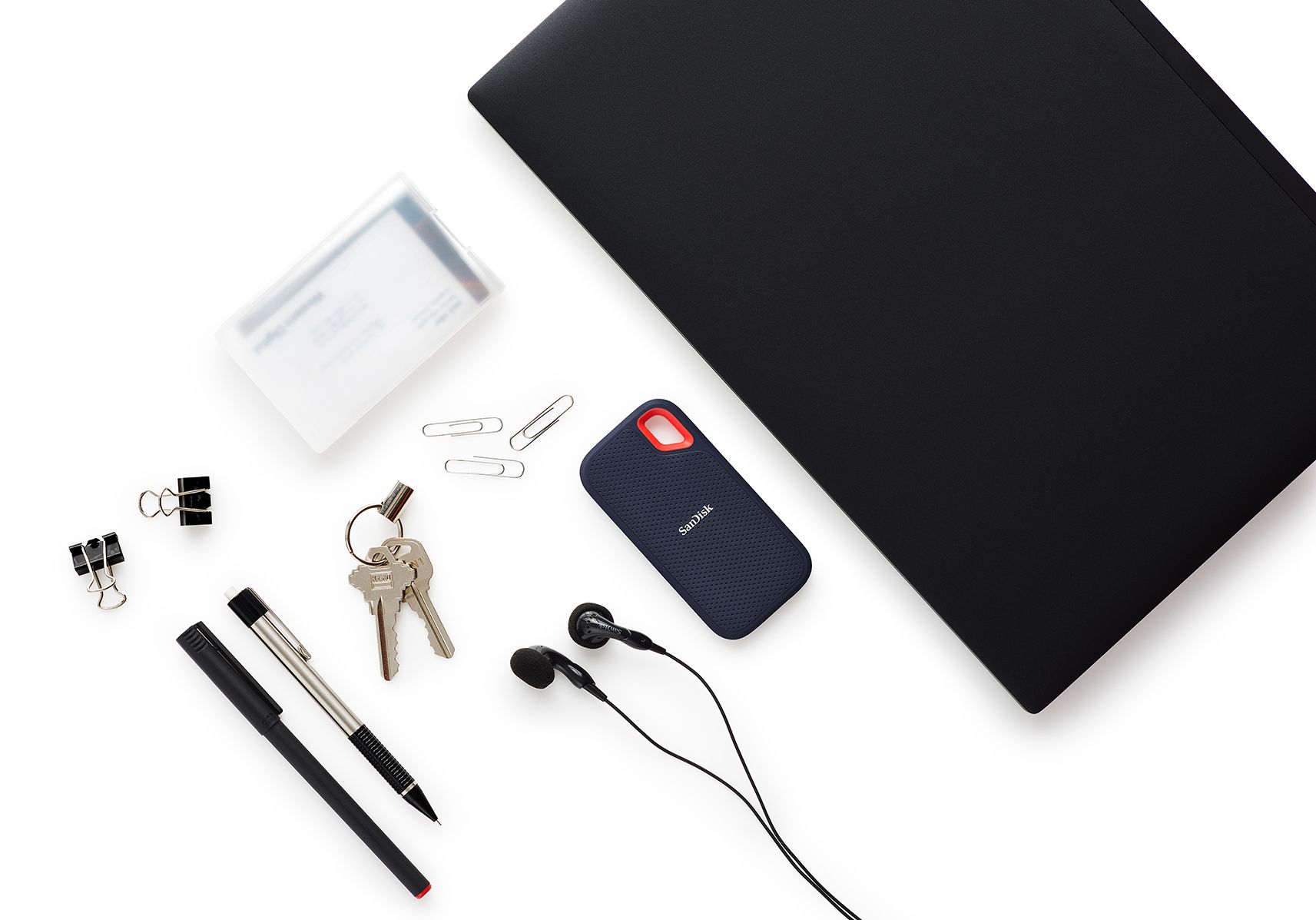 The SanDisk Extreme SSD is designed for the outdoor enthusiast where performance, durability and a rugged aesthetic matter. The drive was created with a rigid ABS core with a silicone exterior. Not only does the silicone feel great it keeps water out and acts as a bumper passing an IPX55 water and dust resistance2 protection rating. The signature carabiner detail along with the discrete perforated pattern elevates a recognizable design language throughout the line of products.
