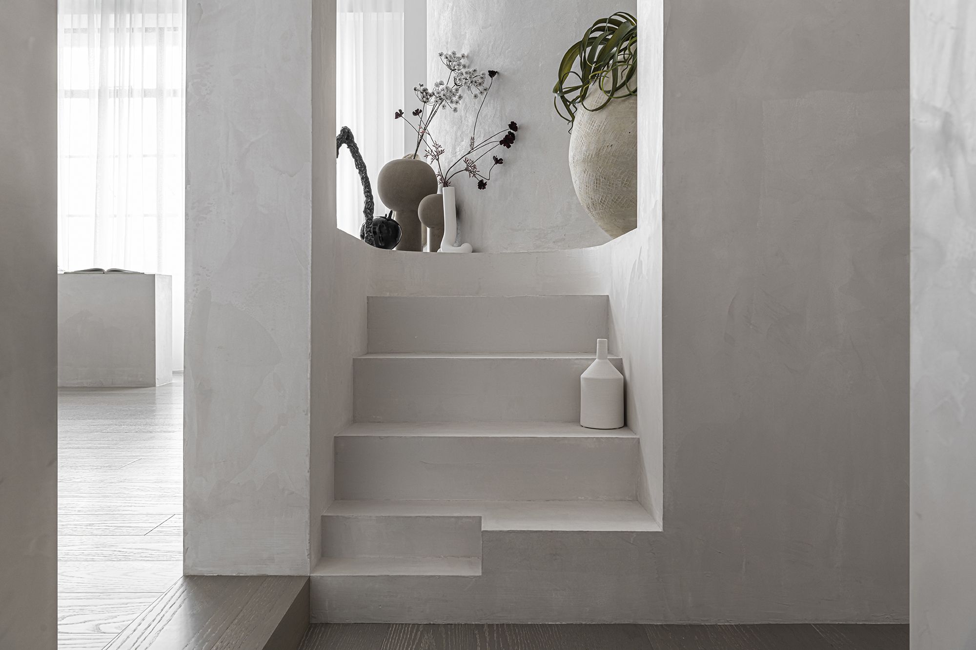 The project integrates office and exhibition. The internal wall, ceiling and staircase are clad in white paint, realizing an expression of dematerialization and highlighting the textured and sculptural features. Designers created a U-shaped area that combines with a long side and the five large windows, allowing natural light to filter in and diffuse freely. The entrance protrudes towards the foyer, due to the consideration of fire control regulations. Its position and width for evacuation bring new opportunities for organizing spatial pattern and form. The overall spatial design starts here.