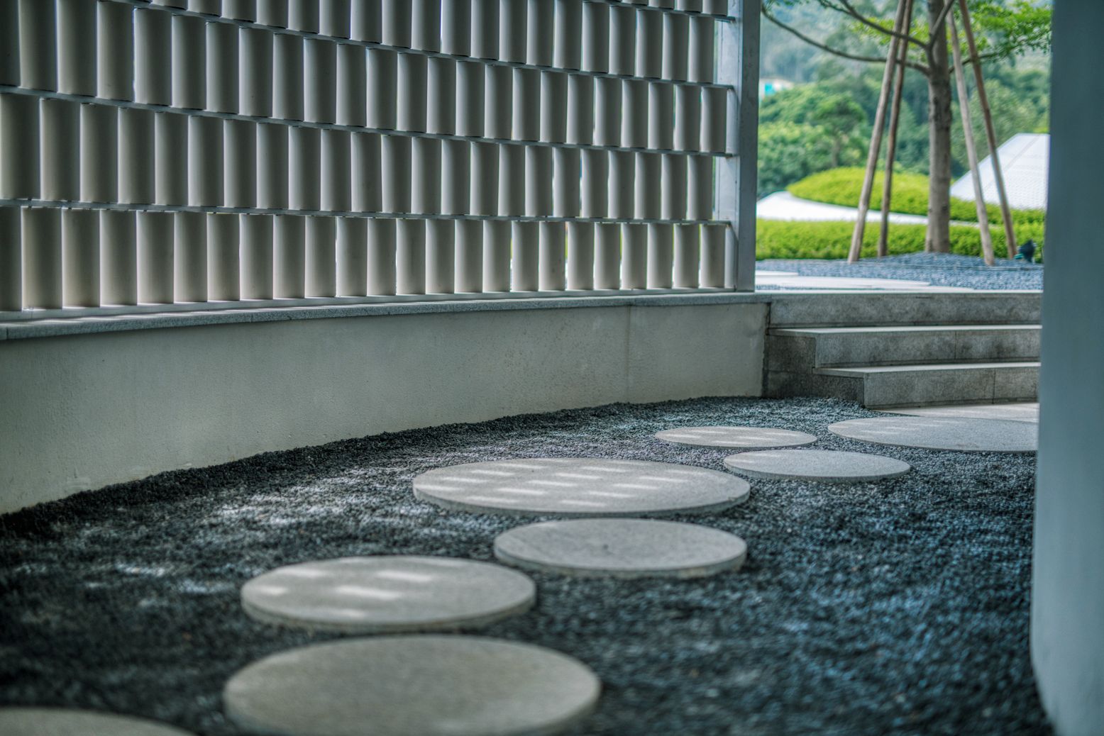 A white glass wall is placed at the main entrance as a barrier between the indoor and outdoor space, where pedestrians and vehicles are guided to both sides. Sunlight and wind can pass through the cylindrical ceramic plates inside the reception hall, while the dock echoes with the lake island. The island is home to various birds and banana trees.