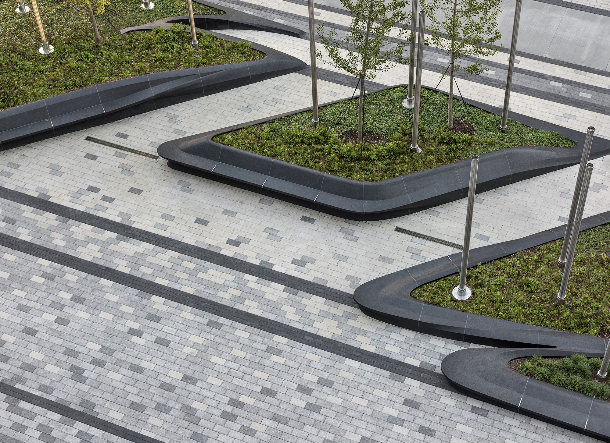 Located in the heart of Back Bay Boston, this urban plaza complements the highest performing office building in New England. It serves as an entrance foyer and public gathering space, and provides year-round, flexible programming. Planters are designed to rise out of fluid paving bands and are sculpted to create multiple seating opportunities. Wind vanes feature color changing lights that are programmed to a weather sensor, highlighting wind intensity. The lighting reflects real-time wind data (from NOAA) in the form of a colorful light show, transforming the plaza into a living wind diagram.